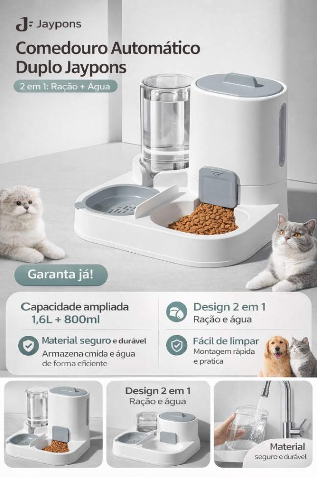 Garanta praticidade, higiene e bem-estar ao seu pet com o Comedouro Automático Duplo Jaypons — uma solução moderna que combina comedouro e bebedouro em um único design funcional.